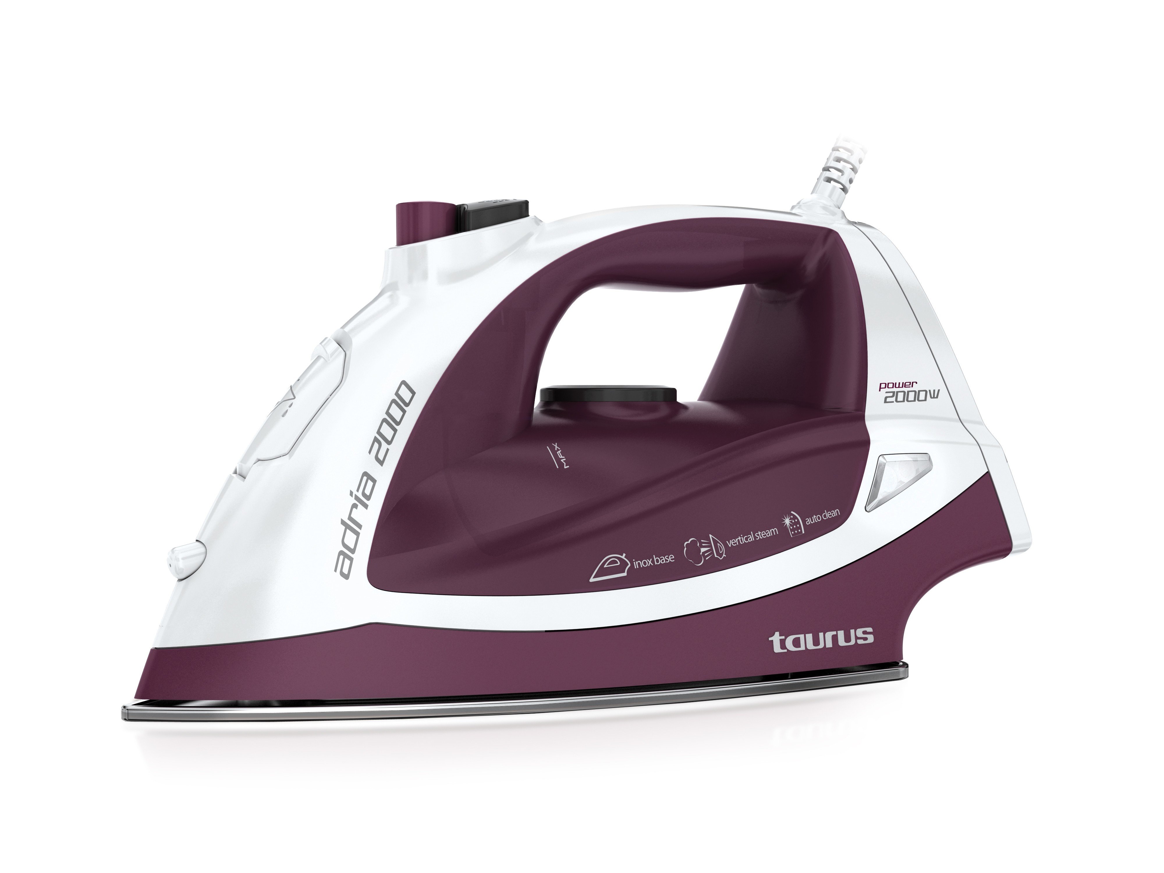 Plancha ropa Taurus ADRIA 2000 inox, 2000w, vapor 35g/mn, suela de acero inoxidable superdeslizante, color granate-blanco, planchado vertical.